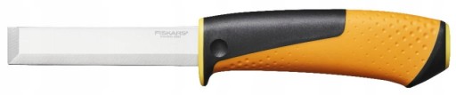 Nóż stolarski Hardware Fiskars. Nóż z masywnym ostrzem przeznaczony do prac stolarskich z serii Hardware marki Fiskars. Posiada dwie naostrzone powierzchnie umożliwiające cięcie. Pierwsza, podłużna powierzchnia może być wykorzystywany jako klasyczny nóż. Druga, poprzeczna pozwala na wykorzystanie noża w charakterze dłuta.