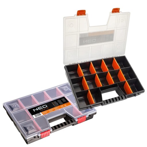Organizer NEO (nr ref. 84-110) o wymiarach 39 x 29 x 6.5 cm. Wykonany z solidnego tworzywa, praktyczny organizer z regulowanymi przegrodami, umożliwiającymi dostosowanie do potrzeb. Posiada przeźroczystą pokrywę oraz komfortowy uchwyt do przenoszenia. Marka NEO spełnia oczekiwania profesjonalistów.
