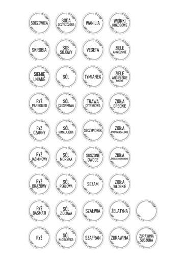 Pełna lista przypraw znajdujących się w zestawie naszych etykiet: