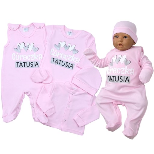 Wyprawka wykonana z bezpiecznego materiału dla delikatnego ciałka maluszka. Na śpiochach i bodach znajduje się napis "Córeczka Tatusia" który dodaje uroku i wywołuje uśmiech na twarzach rodziców oraz innych osób. Zestaw został wykonany w 100% przez polskiego producenta.