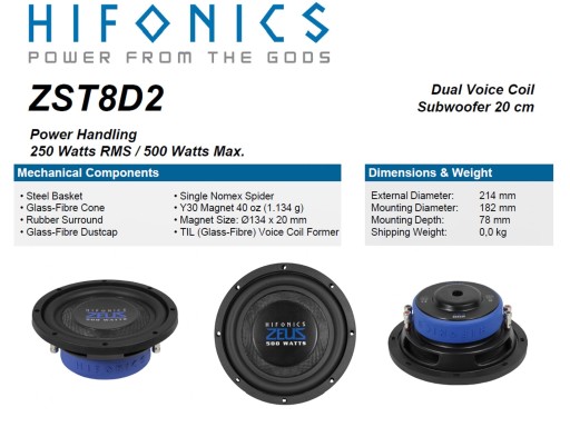 HiFonics ZST8D2 - subwoofer średnica 200 mm, moc 250 Wat RMS, Impedancja 2x2 Ohm