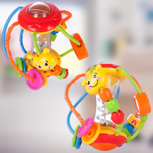 ✅ Zabawka jest kolorowa a różne atrakcje przyciągają uwagę niemowlaka. Grzechotka wspomaga naukę chwytania i wrażliwość na dźwięki.
