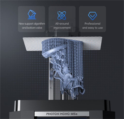 Photon Mono M5s jest w stanie osiągnąć średnią prędkość drukowania 105 mm/h*. Wykorzystuje folię uwalniającą o dużej prędkości, która jest w stanie obniżyć siłę uwalniania, co zapewnia wysoki wskaźnik powodzenia drukowania przy jednoczesnym zmniejszeniu wysokości uwalniania i zwiększeniu prędkości podnoszenia.