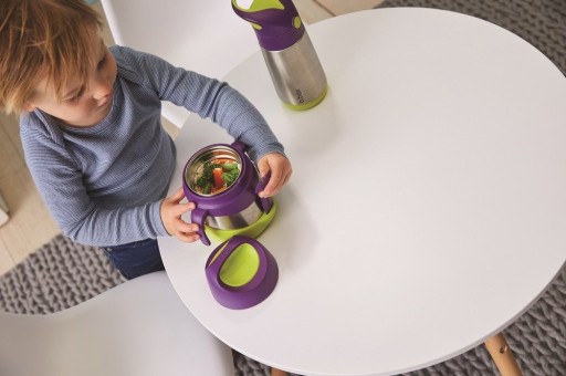 Termos na jedzenie b.box o pojemności 335 ml, z silikonowym widelczykiem, podwójnymi ściankami ze stali nierdzewnej i szczelnym zamknięciem. Termiczny pojemnik na dania obiadowe utrzymuje posiłki w pożądanej temperaturze jeszcze dłużej: ciepłe do 5 godzin, chłodne do 7 godzin. Termos nie przecieka, ma zintegrowany uchwyt do łatwego przenoszenia i zawieszania np. przy wózku podczas spaceru.