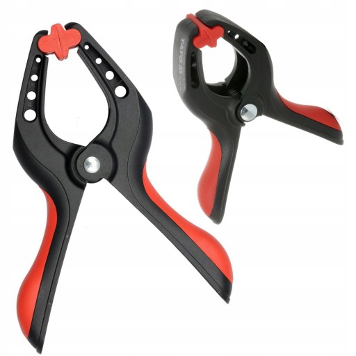 Ścisk sprężynowy 100 mm. Wykonany z tworzywa z silną sprężyną dociskową i ruchomymi płaskimi końcówkami dociskowymi. Do lekkich prac stolarskich lub wykończeniowych. Pomocne przy klejeniu,wierceniu nitowaniu.