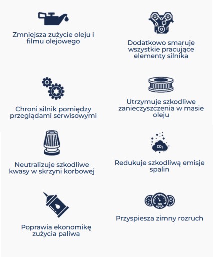 Wszystkie dodatki do olejów silnikowych, które, wchodzą w skład preparatu, pozwalają utrzymać silnik w czystości, a także zmniejszyć jego zużycie.