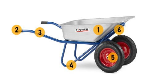 Tworząc taczkę HIGHER naszym celem było skonstruowanie wysokiej jakości ergonomicznego narzędzia, odpowiednio dostosowanego do wzrostu człowieka. Nie zaniżamy wielkości konstrukcji stelaża, bo dbamy o to, aby nasz produkt był ergonomiczny i dostosowany do wygodnej pracy. Rączki w taczce wykonane są z antypoślizgowego polietylenu, który zapewnia odpowiedni chwyt i wygodę pracy. Zastosowany materiał jest bardzo trwały i wytrzymały.
