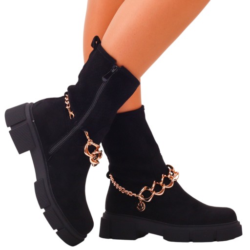 Damskie botki, glany w kolorze czarnym z ozdobnym łańcuchem. ❤ Zapinane na suwak oraz mają wykończenie ażurowe na cholewce. Płaska, stabilna podeszwa zapewnia komfort użytkowania.