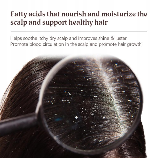 Pomaga łagodzić swędzącą suchą skórę głowy i poprawia połysk, wspomagając krążenie krwi w skórze głowy i promując wzrost włosów