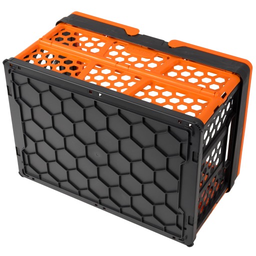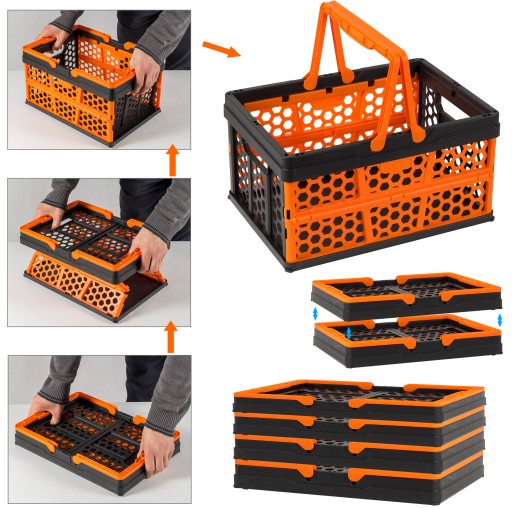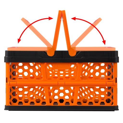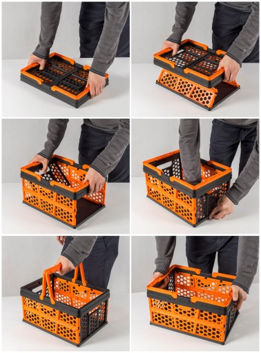 Składana konstrukcja ułatwia przechowywanie lub transport koszyka np. w bagażniku samochodowym. Umożliwia też piętrowanie zapakowanych produktami koszyków jeden na drugim tworząc estetyczną przestrzeń do przechowywania w warsztacie, garażu czy w pokoju domowym.