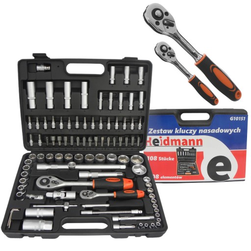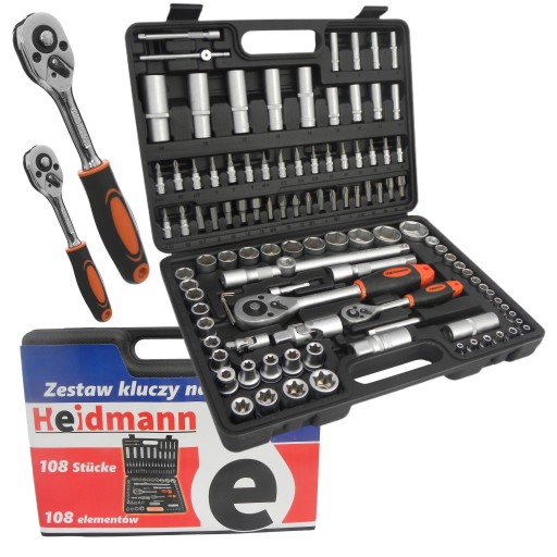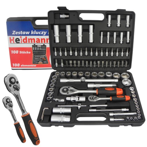 Zestaw 108-elementowy kluczy nasadowych i bitów. Całość narzędzi wykonano ze stali chromowo-wanadowej.