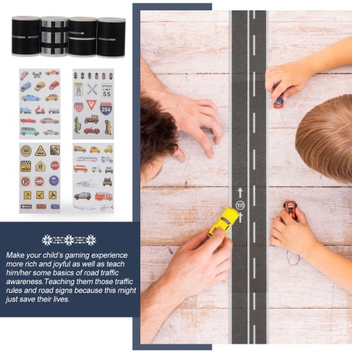 Nasza taśma samoprzylepna z bardzo realistycznym wzorem drogi i znakami drogowymi to najlepsza alternatywa dla cukierków i małych zabawek, które łatwo się psują. Spędź trochę czasu ze swoimi dziećmi, budując miasta ich marzeń, bawiąc się samochodami, ciężarówkami, pojazdami budowlanymi, motocyklami i tak dalej.