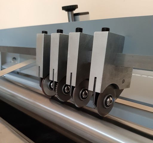 Oferowana nacinarka (rycówka) doskonale się sprawdza w nacinaniu arkuszy materiałów samoprzylepnych ( papier, folia PCV, folia aluminiowa, tkanina i inne). Nacinanie przebiega po liniach prostych na paski lub prostokątny. Linia cięcia jest gładka bez pogrubień. Urządzenia te posiadają prostą budowę na którą składa się metalowy korpus, w którym umieszczony jest wałek pędny oraz umocowana jest belka nośna opraw z narzędziami co daje sztywną konstrukcję zapewniającą bardzo dokładną obróbkę materiałów. Noże tnące spełniają dwie funkcje: arkusz przesuwają i nacinają (perforują, bigują). Zalety: bardzo wygodne urządzenie w użyciu, łatwa regulacja i wymiana noży. A co najważniejsze 100 % powtarzalność.