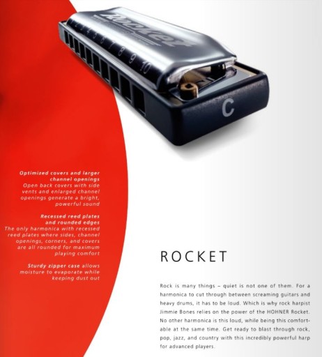O muzyce rockowej można powiedzieć wiele rzeczy, ale "cicha" to zdecydowanie nie jedna z nich! Żeby Twoja harmonijka nie zaginęła pośród ostrych gitar i ciężkiej perkusji musi być ona równie głośna. Dlatego właśnie wielu rockowych harmonijkarzy takich jak Jimmie Bones polega na potędze harmonijki Rocket od Hohnera. Trudno o harmonijkę która byłaby tak głośna i wyrazista, a jednak wygodna w graniu w tym samym czasie. Już teraz uzbrój się w harmonijkę Rocket i wbij się w brzmienie muzyki metal, country i rock.