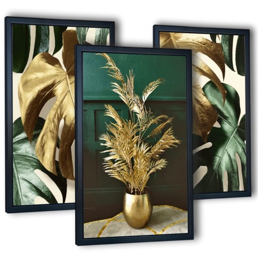 Zestaw zawiera 3 obrazy, które doskonale będą prezentowały się w salonie, pokoju gościnnym oraz innych pomieszczeniach. Dominującymi kolorami na obrazach jest ciemna zieleń oraz kolor złoty.