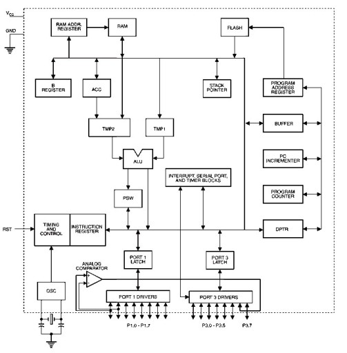 Zastosowano komparator analogowy, oscylator pokładowy i obwody zegarowe. Dodatkowo AT89C2051 został zaprojektowany z logiką statyczną do operacji na częstotliwości zerowej i obsługuje dwie funkcje oszczędzania energii: