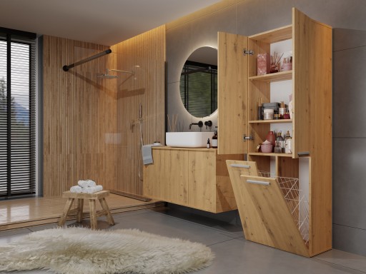 - Szafka posiada 3 praktyczne, zamykane półki oraz 2 kosze na pranie