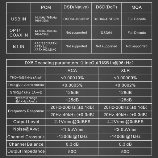 DX5 korzysta z certyfikatu Hi-Res Audio Wireless dzięki integracji układu odbiornika Bluetooth QCC5125 obsługującego kodeki transmisji zdolne do transmisji w wysokiej rozdzielczości. Dzięki temu jest kompatybilny z protokołami aptX, aptX HD, aptX LL i LDAC, a także ze standardami SBC i AAC. Co więcej, sygnał odbierany przez układ Bluetooth jest dekodowany przez parę przetworników DAC ES9068AS, znacznie mocniejszych niż przetwornik DAC zintegrowany z odbiornikiem Bluetooth.