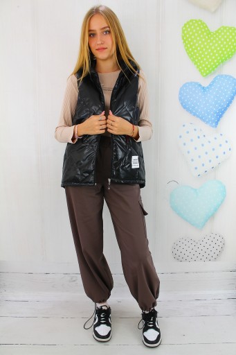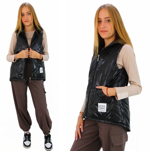 NOWOŚĆ CZARNA PIKOWANA KAMIZELKA Z NASZYWKAMI I KAPTUREM