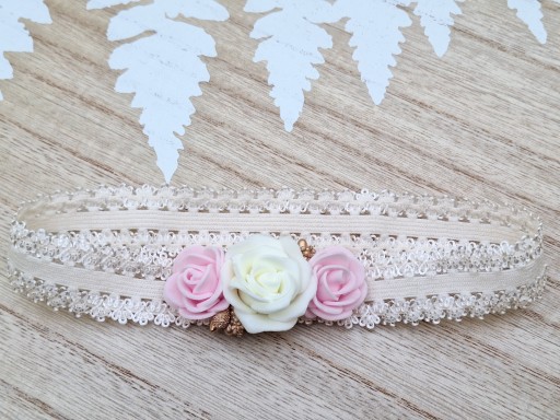 Opaska w kolorystyce różu i ecru na koronce w kolorze ecru z dodatkami złota.