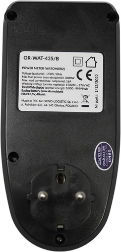 Cyfrowy licznik pomiaru energii ORNO OR-WAT-435, tzw. watomierz pozwala na nadzorowanie i sprawdzenie ilości, kosztu pobieranej energii przez urządzenie pod, które zostanie podłączone. Dzięki niemu można łatwo sprawdzić, które urządzenie pobiera nadmierną ilość energii i wprowadzić skuteczny plan oszczędzania. Duży wyświetlacz LCD zapewnia łatwą obsługę oraz czytelny i przejrzysty pomiar.
