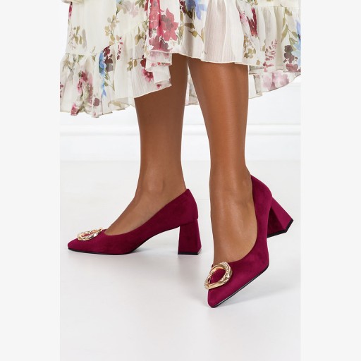 Bordowe czółenka damskie na słupku model D23WX1-BU zostały wykonane z wysokogatunkowego zamszu ekologicznego co gwarantuje doskonałą jakość, wygodę i dopasowanie do stopy. Czółenka posiadają skórzaną wkładkę, która zapewnia odpowiednią cyrkulację powietrza. Bordowe czółenka to eleganckie i klasyczne obuwie, które jest popularnym wyborem na wiele okazji, a złota ozdoba dodaje im subtelnej i stylowej nuty. Cyrkonie umieszczone na złotej ozdobie nadają butom wyjątkowego uroku i przyciągają wzrok. Czółenka z taką dekoracją są doskonałym wyborem zarówno do formalnych, jak i nieformalnych okazji. Można je nosić do pracy, na spotkania biznesowe, przyjęcia lub wieczorne wyjścia. Pasują zarówno do sukienek, spódnic, jak i do spodni, dodając stylowego akcentu do różnych rodzajów ubrań. Model ten posiada wygodny i stabilny obcas, który gwarantuje komfort dla stóp. W sklepie Casu znajdziesz wiele wariantów tego wzoru.