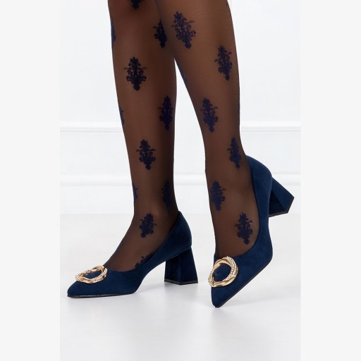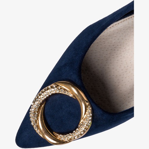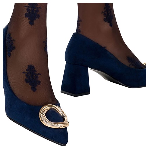Granatowe czółenka damskie na słupku model D23WX1-N zostały wykonane z wysokogatunkowego zamszu ekologicznego co gwarantuje doskonałą jakość, wygodę i dopasowanie do stopy. Czółenka posiadają skórzaną wkładkę, która zapewnia odpowiednią cyrkulację powietrza. Granatowe czółenka to eleganckie i klasyczne obuwie, które jest popularnym wyborem na wiele okazji, a złota ozdoba dodaje im subtelnej i stylowej nuty. Cyrkonie umieszczone na złotej ozdobie nadają butom wyjątkowego uroku i przyciągają wzrok. Czółenka z taką dekoracją są doskonałym wyborem zarówno do formalnych, jak i nieformalnych okazji. Można je nosić do pracy, na spotkania biznesowe, przyjęcia lub wieczorne wyjścia. Pasują zarówno do sukienek, spódnic, jak i do spodni, dodając stylowego akcentu do różnych rodzajów ubrań. Model ten posiada wygodny i stabilny obcas, który gwarantuje komfort dla stóp. W sklepie Casu znajdziesz wiele wariantów tego wzoru.
