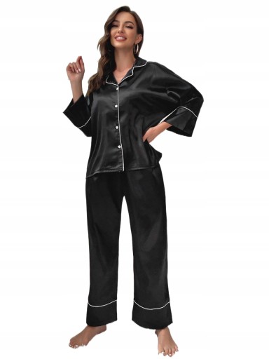 Elegancka satynowa piżama na wyjątkowe wieczory. Materiał, z którego jest wykonana to efektowna miękka, połyskująca tkanina, przyjemna w dotyku. Bluzka z długim rękawem o eleganckim fasonie z wykładanym kołnierzem. Koszulowa góra zapinana na guziki. W połączeniu z prostymi spodniami stanowi bardzo wygodny i elegancki komplet. Satyna subtelnie podkreśla kobiece kształty co sprawi że poczujesz się w nim wyjątkowo.