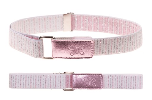 Pasek dla dzieci z regulowaną długością jest wykonany z wysokiej jakości taśmy elastycznej (gumy) o szerokości 2,5cm z brokatową nitką. Idealny na każdy dzień jak i wszelkie uroczystości. Posiada skórzane zapięcie na rzep z motywem motylka, z którym doskonale poradzi sobie każde dziecko. Dzięki regulacji długości pasek będzie służył dziecku przez wiele lat.