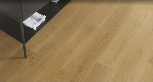 Podłoga trzywarstwowa: Dąb na rdzeniu HDF z drewnianym spodem.