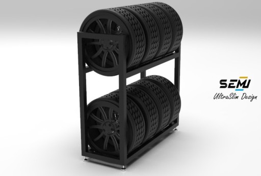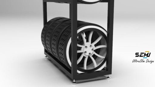 Wykonany z solidnych profili 5x5cm stelaż oraz posiadające regulowane stopki samopoziomujące M12 . Ciężar pełnych kół czyli felgi z oponami bywa duży, stelaże z mniejszych profili mogą być niestabilne, my oferujemy profesjonalny stelaż z grubych profili, połączenie prostoty i solidności.