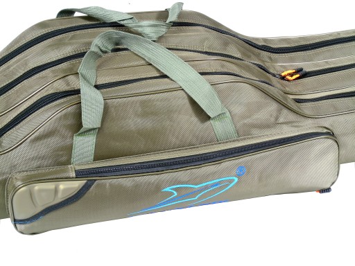 Uniwersalny pokrowiec wędkarski wyposażony w 3 komory służące do transportu wędzisk z kołowrotkami.