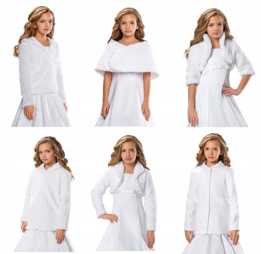Mamy do zaoferowania Państwu piękny sweterek komunijny z długim rękawem, bez stójki. Wykonany jest bardzo starannie z dzianiny o fakturze różyczek, dostępny w kolorze białym. Sweterek jest zapinany na napy, bez podszewki.
