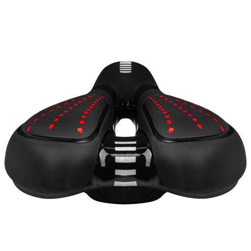 Siodełko jest dostępne w dwóch wariantach kolorystycznych: czarne z niebieskimi lub czerwonymi kropkami. Możesz wybrać ten, który najlepiej pasuje do Twojego roweru lub stylu.