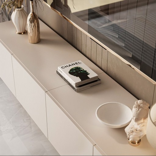 Jednym z najciekawszych rozwiązań tej szafki są fronty otwierane do dołu za pomocą dyskretnych siłowników oraz innowacyjnego systemu "push to open". Dzięki temu, delikatny naciśnięcie na front szafki sprawia, że drzwi otwierają się lekko i bezgłośnie, odsłaniając przechowywane wewnątrz przedmioty. Ten bezuchwytowy mechanizm nie tylko nadaje meblowi nowoczesnego wyglądu, ale także sprawia, że korzystanie z szafki jest wygodne i intuicyjne.