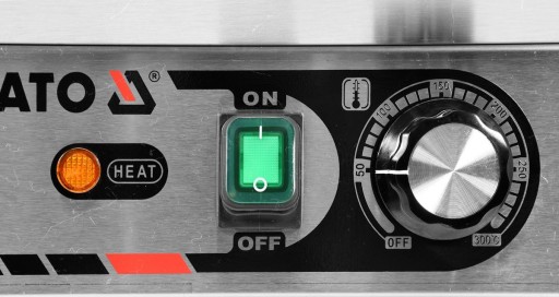 Grzałka o mocy 3,0kW posiada sterowanie za pomocą potencjometru z regulacją temperatury pracy w zakresie 50~300ºC, który umieszczony jest na panelu frontowym. Natomiast z tyłu urządzenia umieszczony jest bryzgoszczelny wyłącznik, który umożliwia wyłączenie grilla, bez konieczności odłączania przewodu zasilającego z sieci. Urządzenie zasilane jest prądem 230V~50Hz. Wbudowany bezpiecznik zapobiega przed przegrzaniem się grilla.