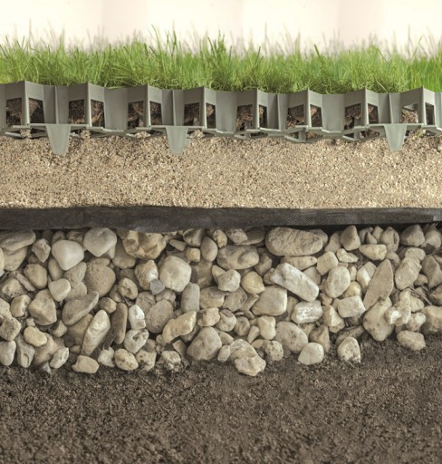 - Ułożenie kratki: Na tak przygotowaną powierzchnię układamy kratkę stabilizującą. Montaż kratki jest bardzo szybki i prosty. Poszczególne elementy kratki łączymy ze sobą za pomocą zaczepów (kolców) znajdujących się na spodniej części dwóch krawędzi. Kratka posiada również na swej dolnej powierzchni 4 kolce stabilizujące, które w trakcie układania wciskamy w podłoże. Kratkę trawnikową można łatwo poddać obróbce za pomocą prostych narzędzi ręcznych lub elektrycznych.Po ułożeniu kratki, całość nawierzchni wyrównujemy za pomocą zagęszczarki. Następnie w zależności od potrzeb, kratkę wypełniamy: ziemią, piaskiem, żwirem lub kruszywem ozdobnym
