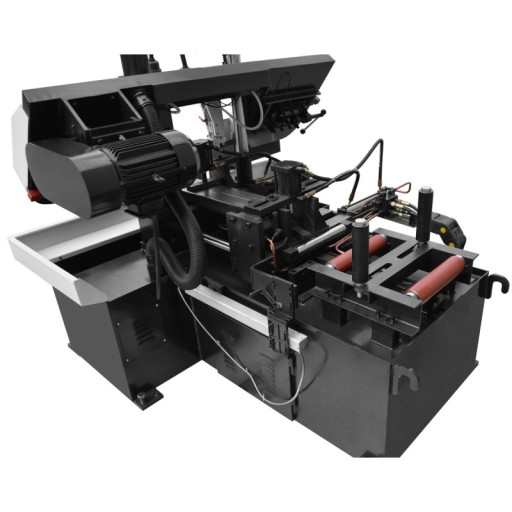 Napęd taśmy tnącej oparty na silniku sterowanym falownikiem zapewnia płynną regulację w dużym zakresie prędkości. Hydrauliczny naciąg taśmy pozwala na uzyskanie optymalnych warunków pracy taśmy. W przypadku zerwania piły maszyna zatrzymuje się automatycznie. Precyzyjne prowadzenie taśmy zapewniają prowadnice składające się z łożysk prowadzących oraz wkładek z węglików spiekanych. Ruchoma głowica prowadząca taśmę jest ustawiana w zależności od wymiaru ciętego materiału, co zapewnia zwiększenie stabilności pracy taśmy. Maksymalne parametry cięcia oraz wydłużoną żywotność piły zapewnia system chłodzenia oraz szczotka czyszcząca.