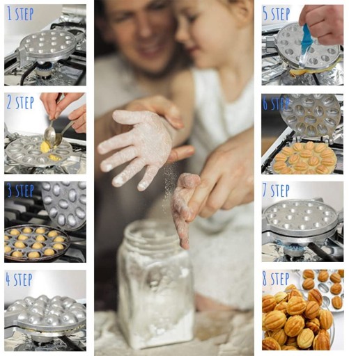 Forma wykonana jest ze specjalnego stopu, który szybko się nagrzewa i długo trzyma ciepło. Jednorazowo potrafi wypiec 16 sztuk ciastek orzeszków.