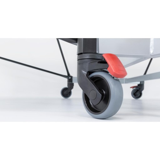 - 4 skrętne koła o średnicy 100 mm z bieżnikiem gumowym na każdym blacie, 2 z blokadą