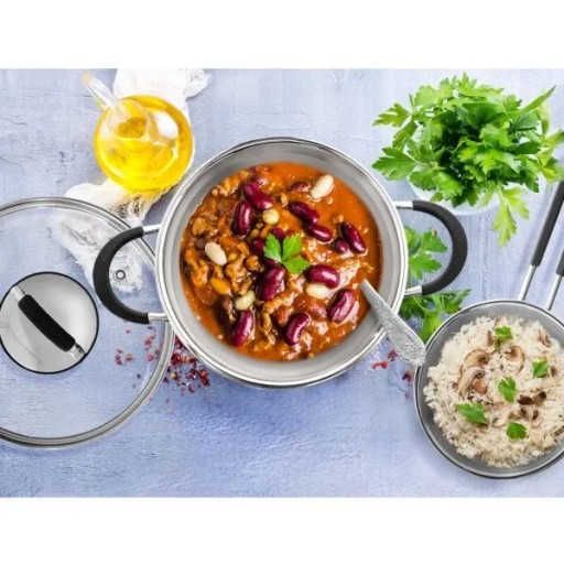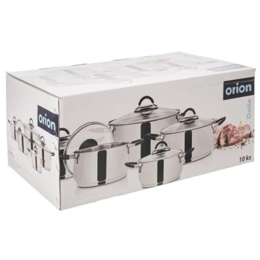 Zestaw stalowych garnków z pokrywkami składający się z dziesięciu elementów. W zestawie: garnek o pojemności 1,8 litra (średnica 16 cm, wysokość 9 cm), garnek o pojemności 2,6 litra (średnica 18 cm, wysokość 10 cm), garnek o pojemności 3,7 litra (średnica 20 cm, wysokość 12 cm), garnek o pojemności 4 litrów (średnica 22 cm, wysokość 10,5 cm) oraz garnek o pojemności 5,3 litra (średnica 24 cm, wysokość 12 cm). Garnki sprawdzą się do gotowania oraz duszenia, przygotujemy w nich różnego rodzaju dania, zupy czy sosy. Niezwykle solidnie wykonane z najwyższej jakości materiałów. Garnki są ciężkie i masywne, posiadają grube i solidne ścianki boczne. Przydatne w każdym domu. Oryginalny produkt czeskiej marki Orion. Wyprodukowano zgodnie z europejskimi standardami.
