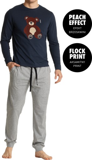 Piżama wyjątkowo miękka i przyjemna w dotyku, wykonana z wysokojakościowej, stuprocentowej bawełny, z tzw. „peach effect” (efekt brzoskwini) - delikatne i puszyste włoski pokrywające dzianinę, sprawiające, że w dotyku przypomina ona skórkę brzoskwini. Koszulka z okrągłym dekoltem, długimi rękawami, spodnie długie z szeroką nieuciskającą gumką w pasie i sznurkiem umożliwiającym regulację. Praktycznym rozwiązaniem są dwie kieszenie boczne.