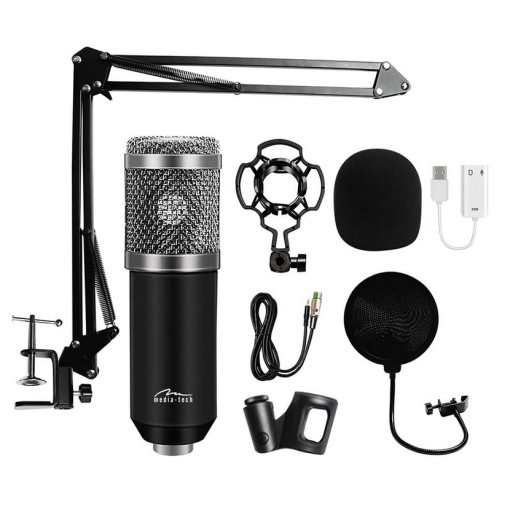 Mikrofon z zestawem akcesoriów MT397SMikrofon pojemnościowy z zestawem akcesoriów do streamingu i nagrań studyjnych. Montaż oraz użytkowanie zestawu jest banalnie proste i nie wymaga specjalistycznej wiedzy.Zestaw do nagrań audio z mikrofonem pojemnościowymStudio&Streaming Microphone MT397 to kompletny, profesjonalny zestaw do nagrań audio z mikrofonem pojemnościowym dla początkujących użytkowników jak i tych średnio zaawansowanych. Montaż oraz użytkowanie zestawu jest banalnie proste i nie wymaga specjalistycznej wiedzy. W zestawie znajdują się wszystkie niezbędne elementy: mikrofon pojemnościowy, regulowany statyw biurkowy, pop-filtr, kosz antywibracyjny, gąbkowa owiewka, zewnętrzna karta dźwiękowa oraz okablowanie.Studio&Streaming Microphone to idealny zestaw dla: