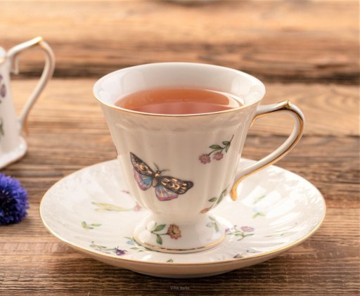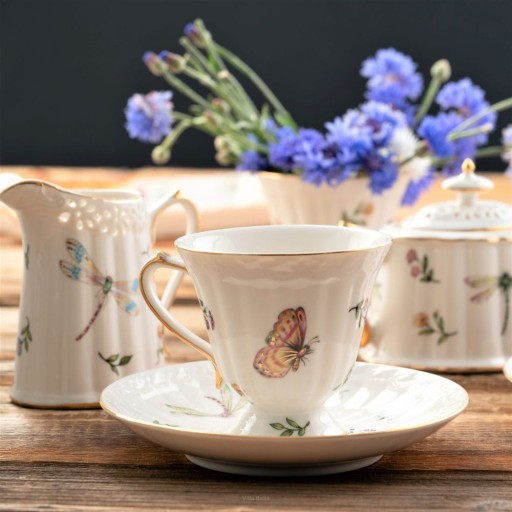 Niezwykle elegancka filiżanka LEDA IVORY w nowym, pięknym odcieniu kości słoniowej. Ta przepiękna filiżanka o niepowtarzalnym kształcie i klasycznym fasonie ozdobiona jest ślicznymi ogrodowymi motywami (motylki, ważki, kwiatuszki, owady). Elementy tej kolekcji nie są identyczne - na części występują motyle (w różnych kolorach), na innych ważki - jest to efekt zamierzony, a nie wada.