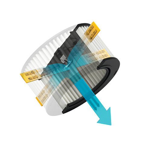 Dzięki zastosowanemu rozwiązaniu czyszczenie filtrów wymagane jest znacznie rzadziej. Czas pomiędzy czyszczeniami istotnie się wydłuża. System działa tak, że większe i cięższe drobiny i pyły przenoszone są przez siłę odśrodkową na zewnątrz, a następnie wyrzucane do góry. Oczyszczone wstępnie w ten sposób powietrze doprowadzane jest do filtra powietrza.