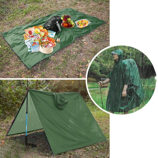 Wykonane z tkaniny poliestrowej z powłoką PU, to ponczo przeciwdeszczowe jest wodoodporne PU5000MM. Kaptur ze sznurkiem chroni twarz, a zapięcie na taśmę samoprzylepną po bokach zapewnia idealne dopasowanie. Może być również używana jako mata kempingowa lub osłona przeciwsłoneczna, idealna na kemping, wędrówki, wędrówki z plecakiem i inne zajęcia na świeżym powietrzu.