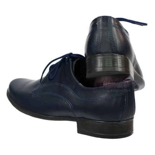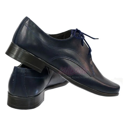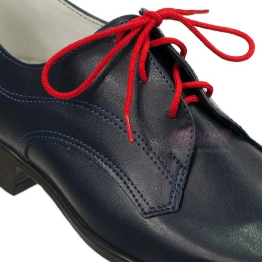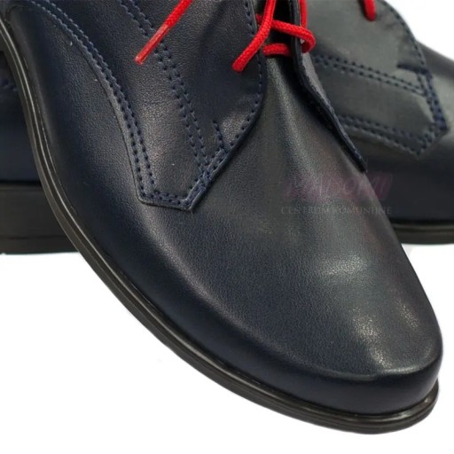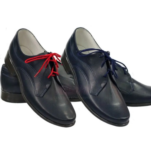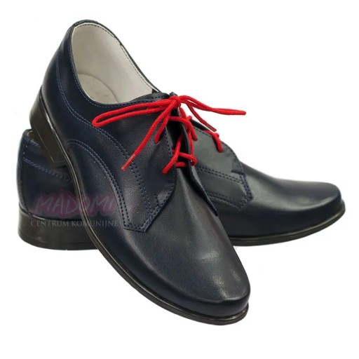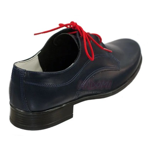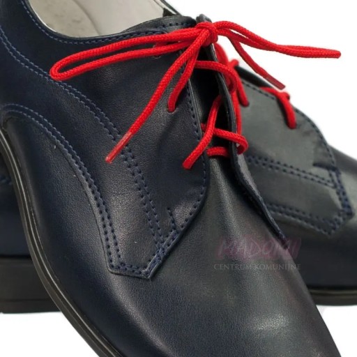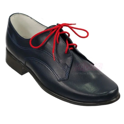 Granatowe buty komunijne dla chłopca Polskiego Producenta obuwia firmy MIKO wykonane ze sztucznej skóry, wkładka ze skórki naturalnej. Buty sznurowane, sznurówki dołączone do obuwia w kolorze granatowym i czerwonym. Z przodu lekkie zaokrąglenia.
