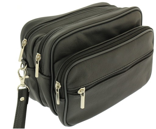- Saszetka posiada: dwie duże komory o wymiarach 24 x 8 cm oraz jedną mniejszą; wyścielona bardzo dobrą jakościowo podszewką, dodatkowy schowek na mniejszej kieszeni zamykany na solidny suwak; wygodny skórzany uchwyt, dzięki któremu można wygodnie nosić saszetkę w ręce