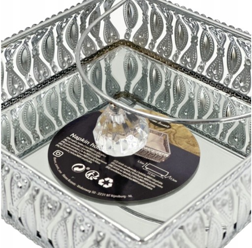 Elegancki pojemnik na serwetki o charakterze dekoracyjnym. Optymalne wymiary pozwolą na przechowywanie dużej ilości serwetek, nie musisz więc martwić się o częste uzupełnianie pojemnika. Serwetnik posiada lustrzane dno oraz kryształową kulę która dociska serwetki co pomaga przy wyciągnięciu pojedyńczej sztuki oraz zapobiega na otwartej przestrzeni przed wiatrem.