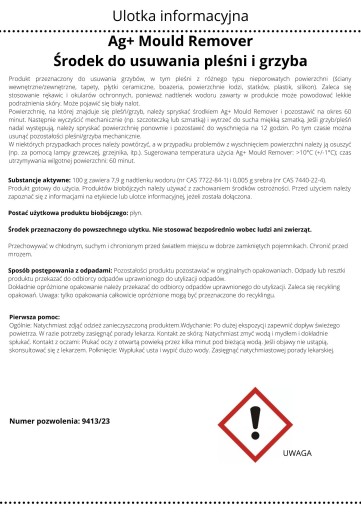 Powierzchnię, na której znajduje się pleśń/grzyb, należy spryskać środkiem Ag+ Mould Remover i pozostawić na okres 60 minut. Następnie wyczyścić mechanicznie (np. szczoteczką lub szmatką) i wytrzeć do sucha miękką szmatką. Jeśli grzyb/pleśń nadal występują, należy spryskać powierzchnię ponownie i pozostawić do wyschnięcia na 12 godzin. Po tym czasie można usunąć pozostałości pleśni/grzyba mechanicznie.